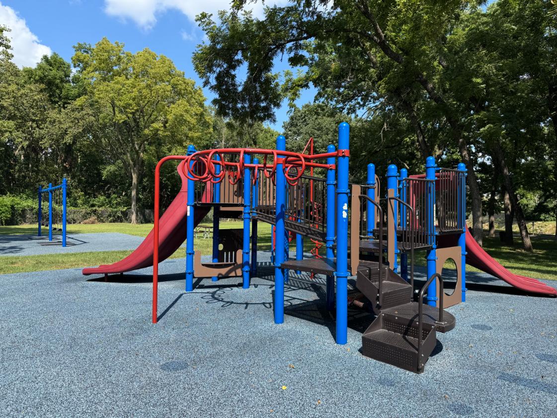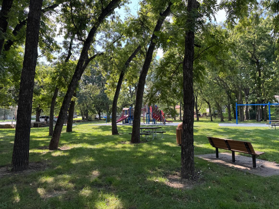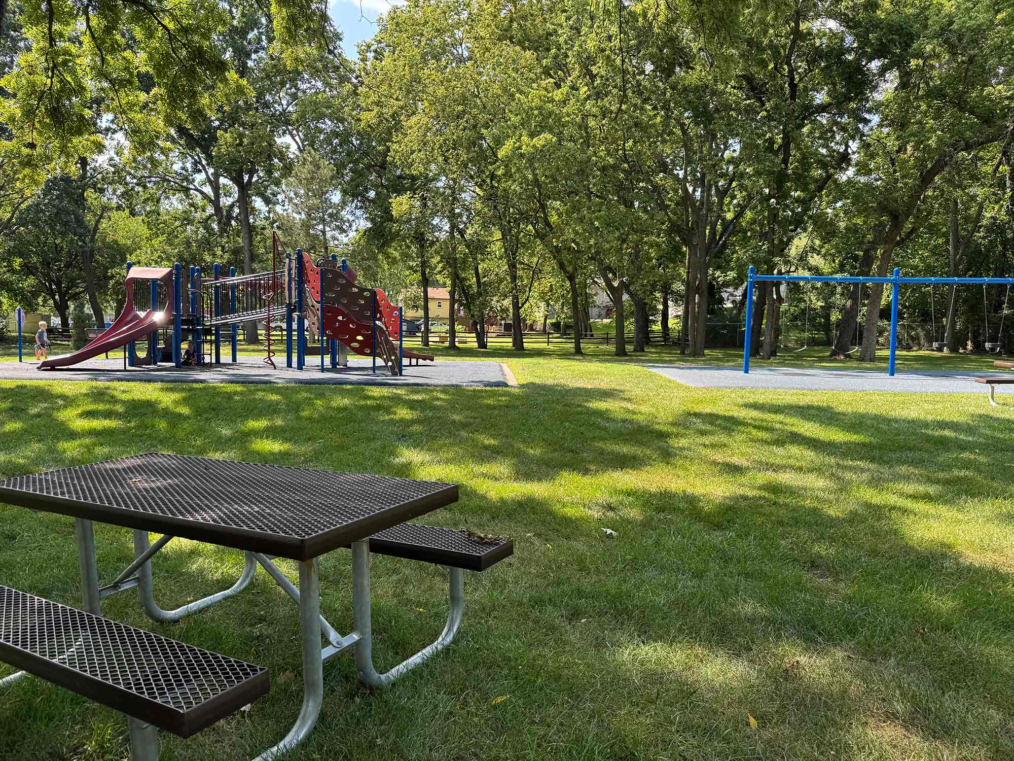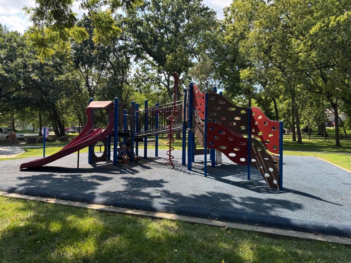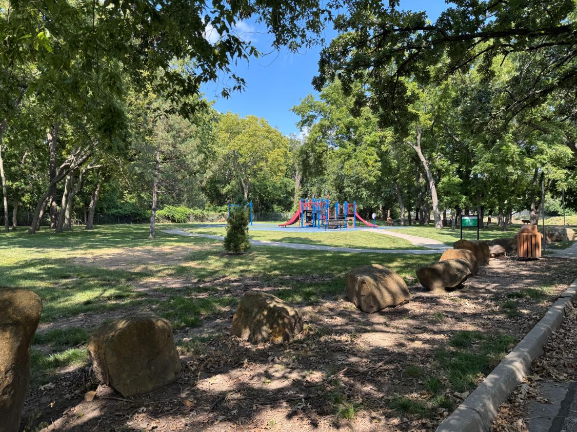Campbell Park Playground in Merriam, Kansas, is a quiet neighborhood spot that sits alongside the scenic Turkey Creek Streamway Trail. This playground is surrounded by mature trees that offer generous natural shade, making it a comfortable place to visit even on warm afternoons. While the play area itself isn’t especially large or toddler-focused, (other than toddler swings) it’s clean, well-maintained, and features benches that overlook the creek. The park includes grassy picnic areas with tables and a small dedicated parking lot, ensuring easy access. There are no restrooms or fencing, but the proximity to the Turkey Creek Trail adds appeal for families who enjoy combining playtime with a short nature walk or bike ride. McLain’s Market, a local favorite for coffee and pastries, is just over a mile away. Campbell Park is a peaceful and shady spot ideal for a simple playground outing or a quick stop along the trail.